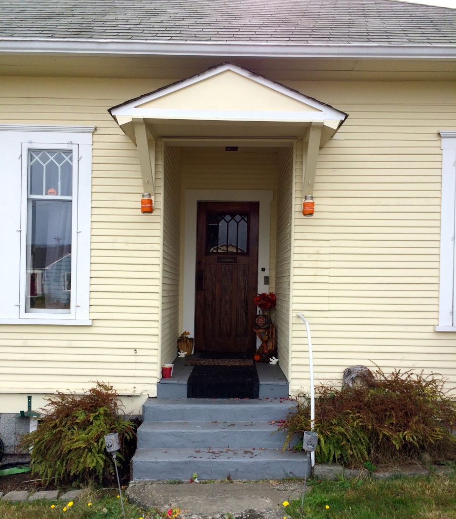 Just earlier today I was browsing my local retail craft store, and paused in front of a display that used mason jars as candle holders. Next to the display they had hangers. A thought came immediately! I have been looking for something to hang in front of my house to replace the once beautiful flower baskets. I could make lanterns. A couple hours later, paused for lunch and to pick up the tiny tot from preschool, my project is finished and looks good. The close-up picture at the end was added to my pinterest, but here is the one with them on the house.